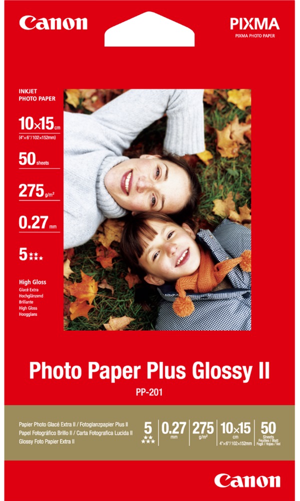Canon Plus Glossy II PP-201 10 × 15 cmLesklý fotografický papír Photo Paper Plus Glossy II od společnosti Canon je ideálním fotografickým papírem pro mimořádně kvalitní výstup s lesklým povrchem. Zajišťuje perfektní povrch digitálních fotografií a všech dotisků.
