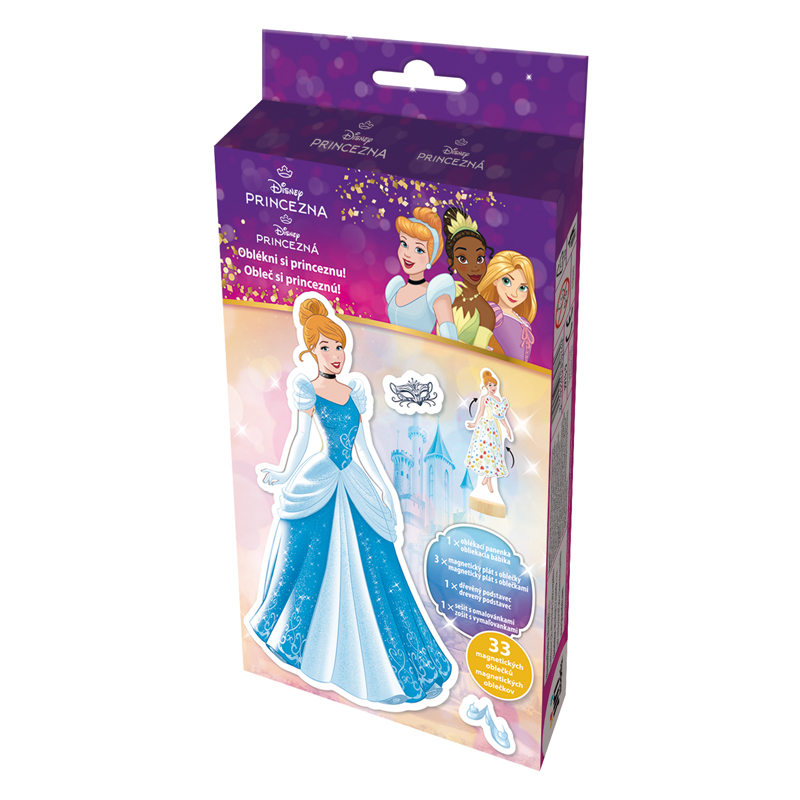 Balenie obsahuje magnetickú bábiku, 33 magnetických častí (oblečenie,topánky, doplnky), drevený podstavec a maľovánku s 8 obrázkami. Motív: Disney princezné.