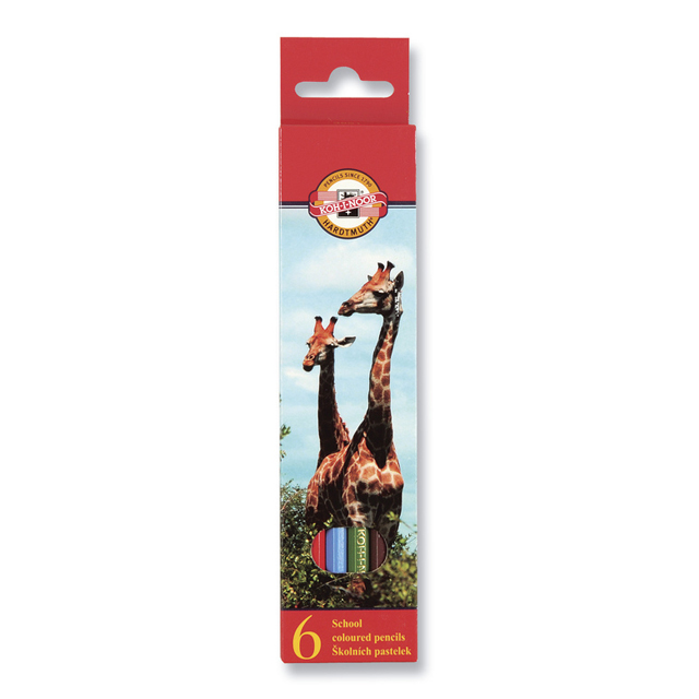 Šesťhranné pastelky KOH-I-NOOR. Počet farieb: 6 ks. Balenie: 24 ks. priemer ceruzy 6,9 mm, d = 175 mm, drevo čínska lipa, hrotené, značené,priemer tuhy 2,8 mm, leštené vo farbe jadra Značka: KOH-I-NOOR.
