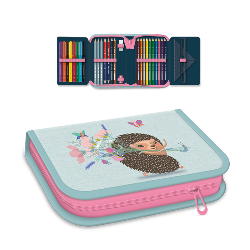 Školský jednoposchodový peračník s 2 klopmi - naplnený s kompletnou výbavou Obsahuje: Pastelky - 12 ks základné farby grafit ceruzky- 3x, fixky - 10 ks základné farby, 2 pravítka- 1x rovné s výrezmi kružnice 16cm a 1x trojuholník 14 cm, strúhadlo, guma, Na klope je priehľadná kapsa, vhodné miesto na školský rozvrh hodín. Rozmer: 200 x 140 x 40 mm. Povrch peračníka je pokrytý textíliou.