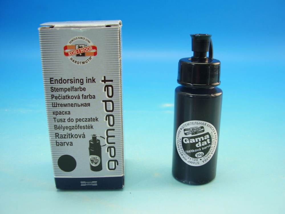 Farba pre samonamáčacie, ručné a mechanické pečiatky z gumy, kovu alebo tvrdenej fólie. Plastová flaštička 20 g.