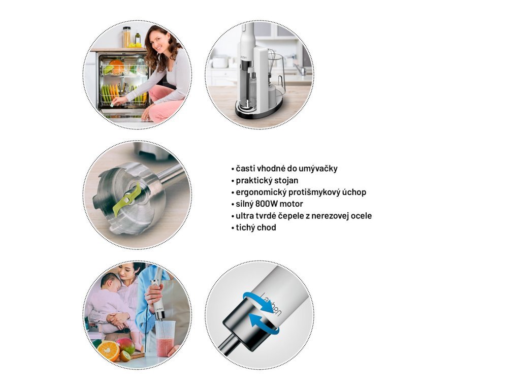 Lauben Stick Blender 800 splní v kuchyni aj tie najnáročnejšie požiadavky. Vďaka motoru s výkonom 800 W a titanovým čepeliam sa nezastaví ani pred tvrdou zeleninou, ktorú potrebujete rozmixovať na hladké pyré. Na výber máte ze 6 rýchlostí a niekoľkých nadstavcov, s ktorými vytvoríte takmer čokoľvek, na čo máte chuť. Od krémových polievok a omáčok až po dokonale vláčnu zemiakovú kašu. Mixér si ale poradí aj s nasekaním orechov do bábovky alebo drtením ľadu do domácich kokteilov. So metlou na šľahanie vykúzlite úplne pevný sneh z bielkov ako mávnutím kúzelnej paličky.