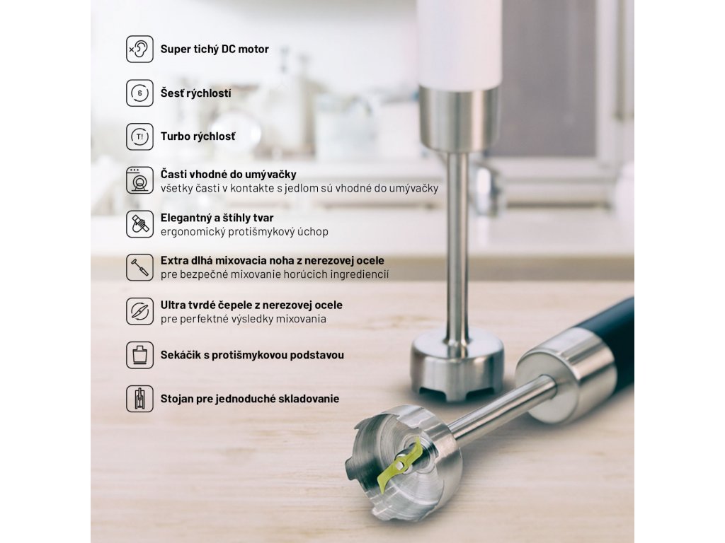 Ovládanie tyčového mixéru zvládne úplne každý. Na výber máte z 6 rýchlostí, samozrejmosťou je aj funkcia TURBO. Mixovací nástavec má extra dlhú nohu, takže môžete bez problému mixovať aj horúce ingrediencie. Všetci poznáme situáciu, kedy mixované ingrediencie z nádoby vystreknú a vy nielen že prídete o polievku na večeru, ale navyše môžete znovu maľovať kuchyňu. S naším mixérom sa vám toto nestane, pretože sme hlavicu vytvarovali tak, aby k nechcenému rozstreknutiu potravín nedošlo. V priebehu domáceho večierka teda nemusíte obliekať zásteru ani pri výrobe kokteilov pre hostí. Istotne vás takisto poteší, že všetky nástavce je možné umývať v umývačke riadu.