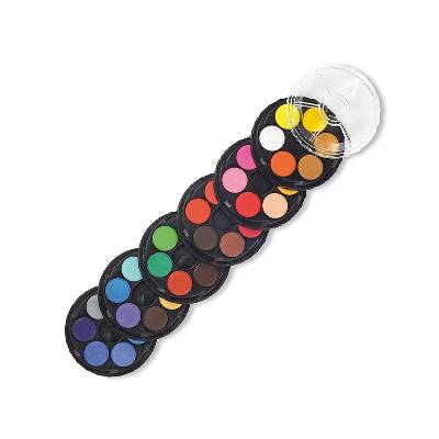 Vodové farby KOH-I-NOOR, počet farieb 36 ks, priemer farieb 22,5 mm. Balenie: 6 ks. Vodové farby okrúhle, priemer tablety 22,5 mm, vodou riediteľné, vhodné na papier a iné savé materiály, šesť vrstiev po 6 tabliet, t.j. 36 odtieňov farieb. Značka: KOH-I-NOOR.